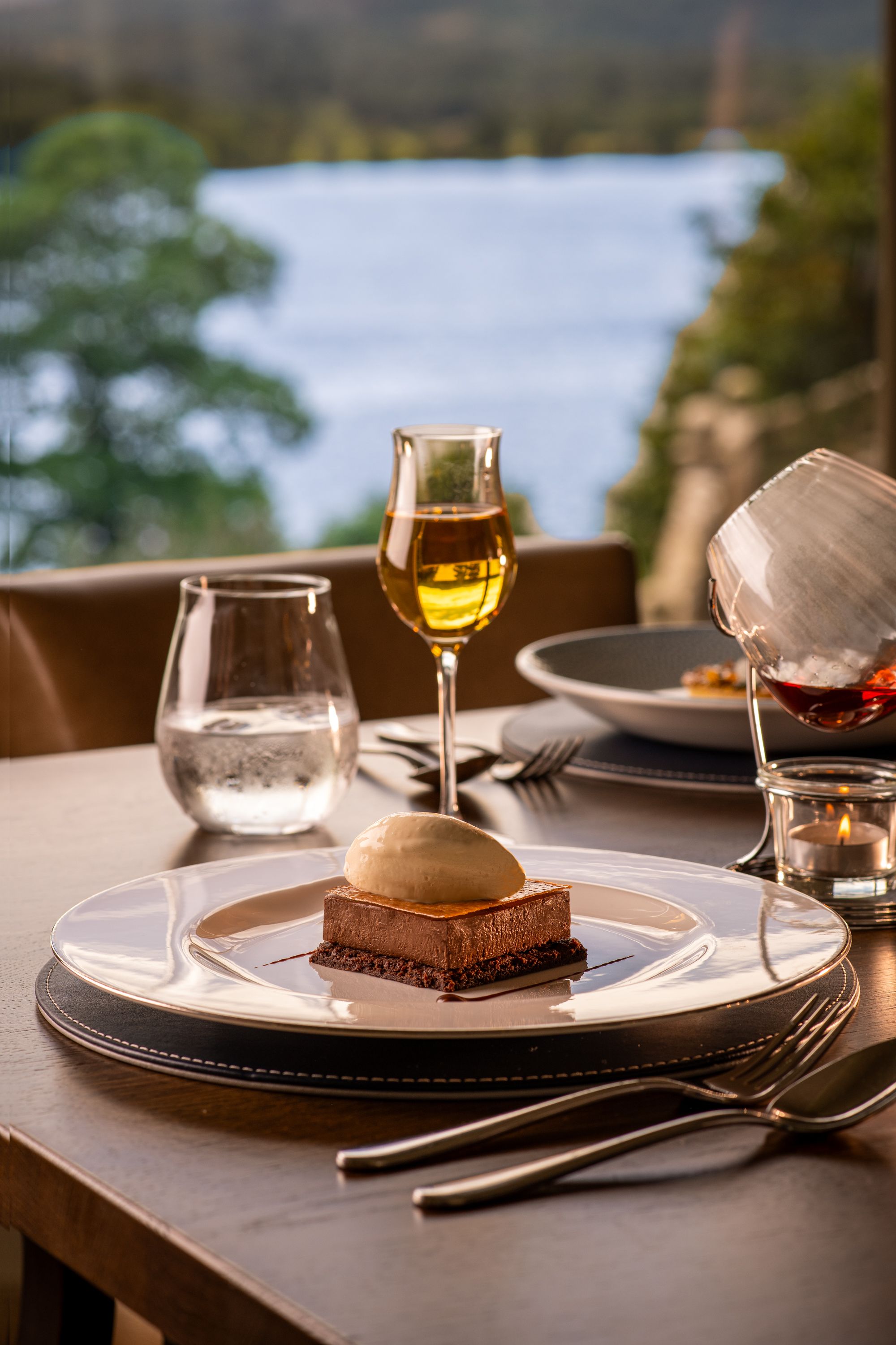 Dessert with champagne by the lake